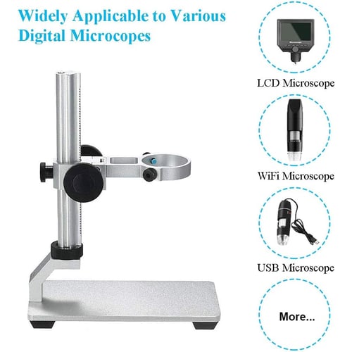 A: It fits most standard cylindrical USB and WiFi digital microscopes, particularly those in the 40mm barrel diameter range. Check your microscope's dimensions before purchasing, as unusually slim or oversized models may not fit the adjustable clamp securely.