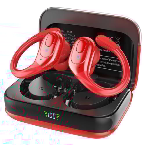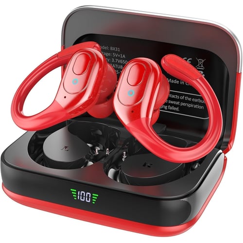sajawass Wireless Earbuds Headphones Bluetooth 5.4, Noise Canceling Ear Buds with 75hr Playtime, IPX7 Waterproof Earphones Over-Ear Earphones for Sports/Workouts, LED Power Display - Red